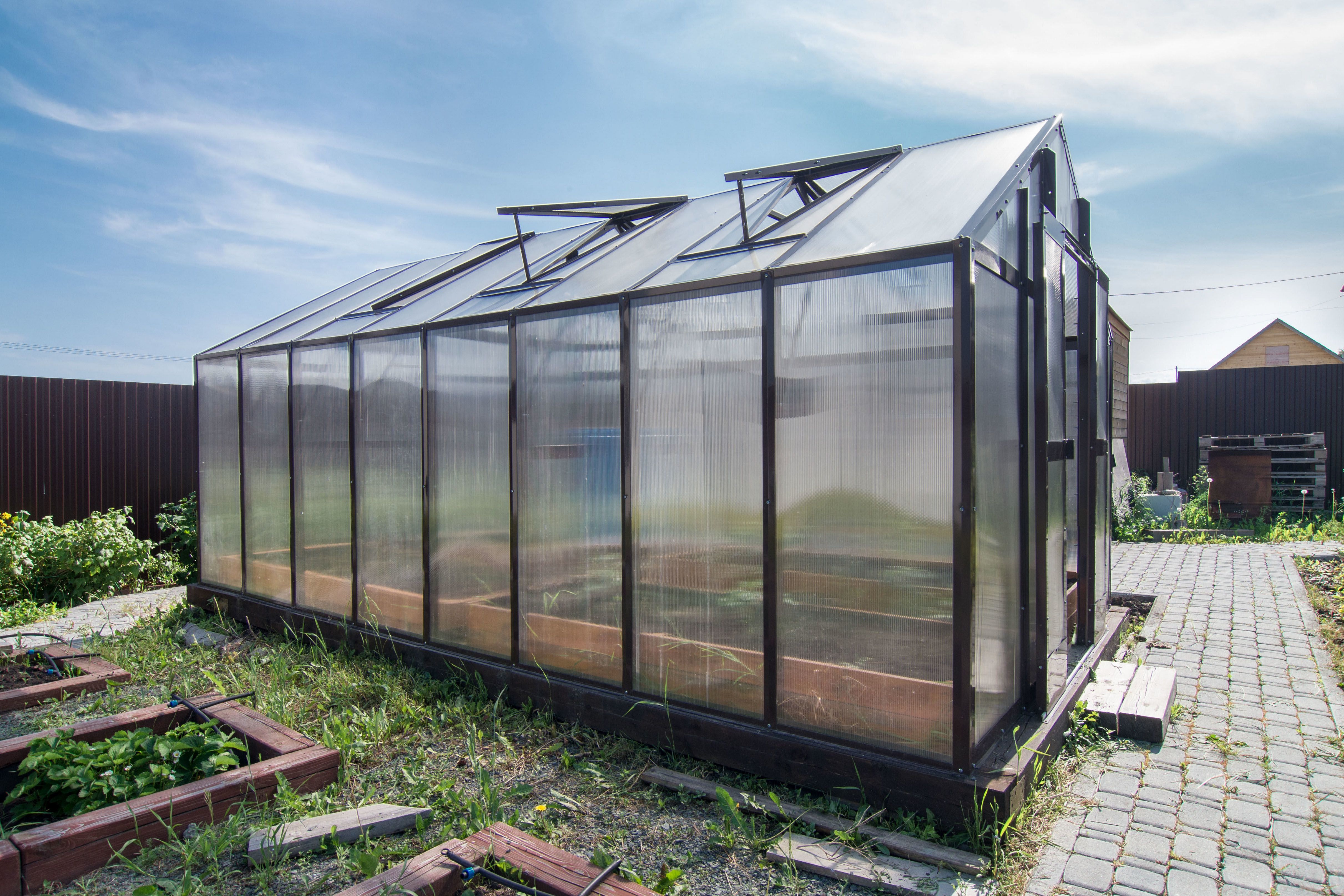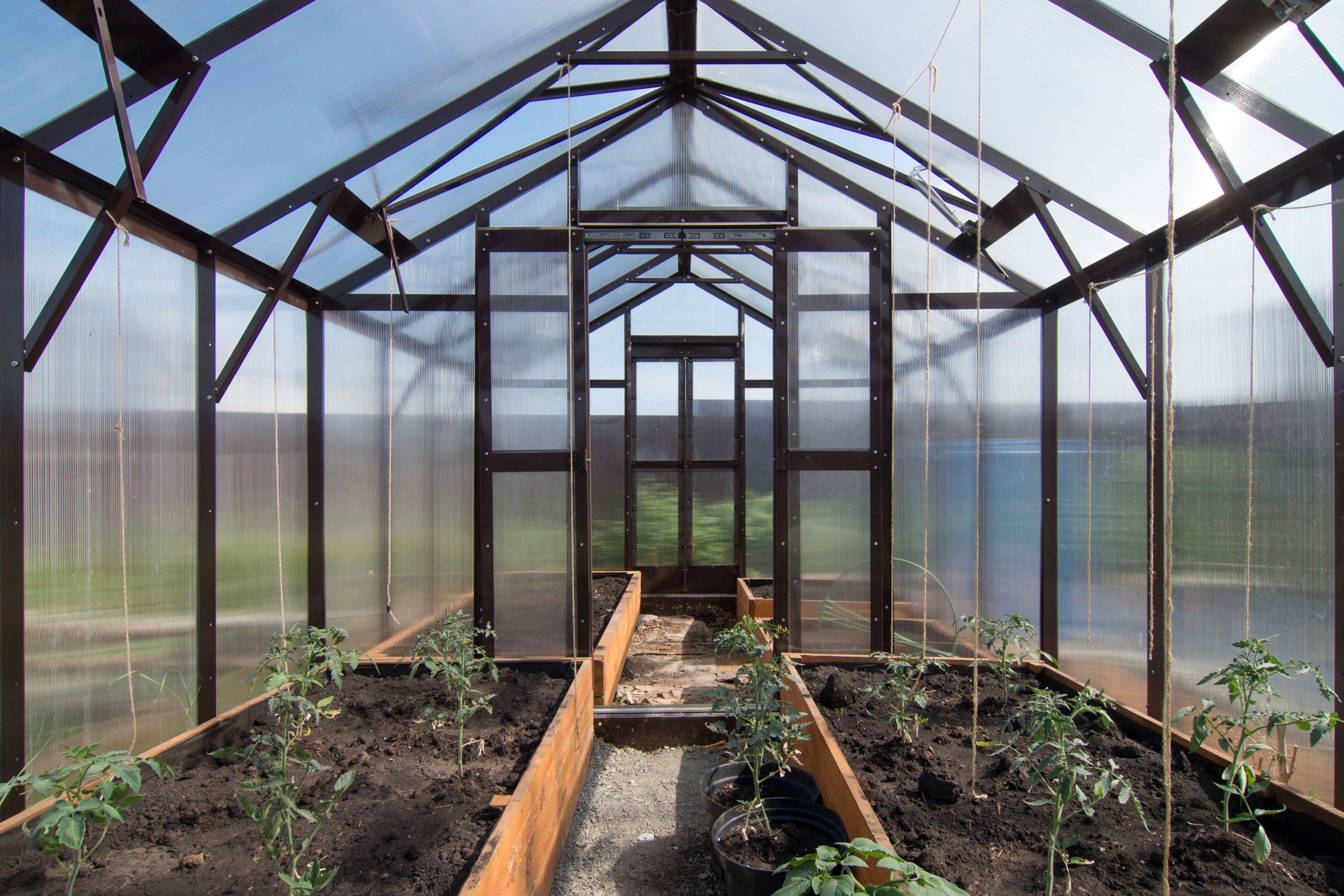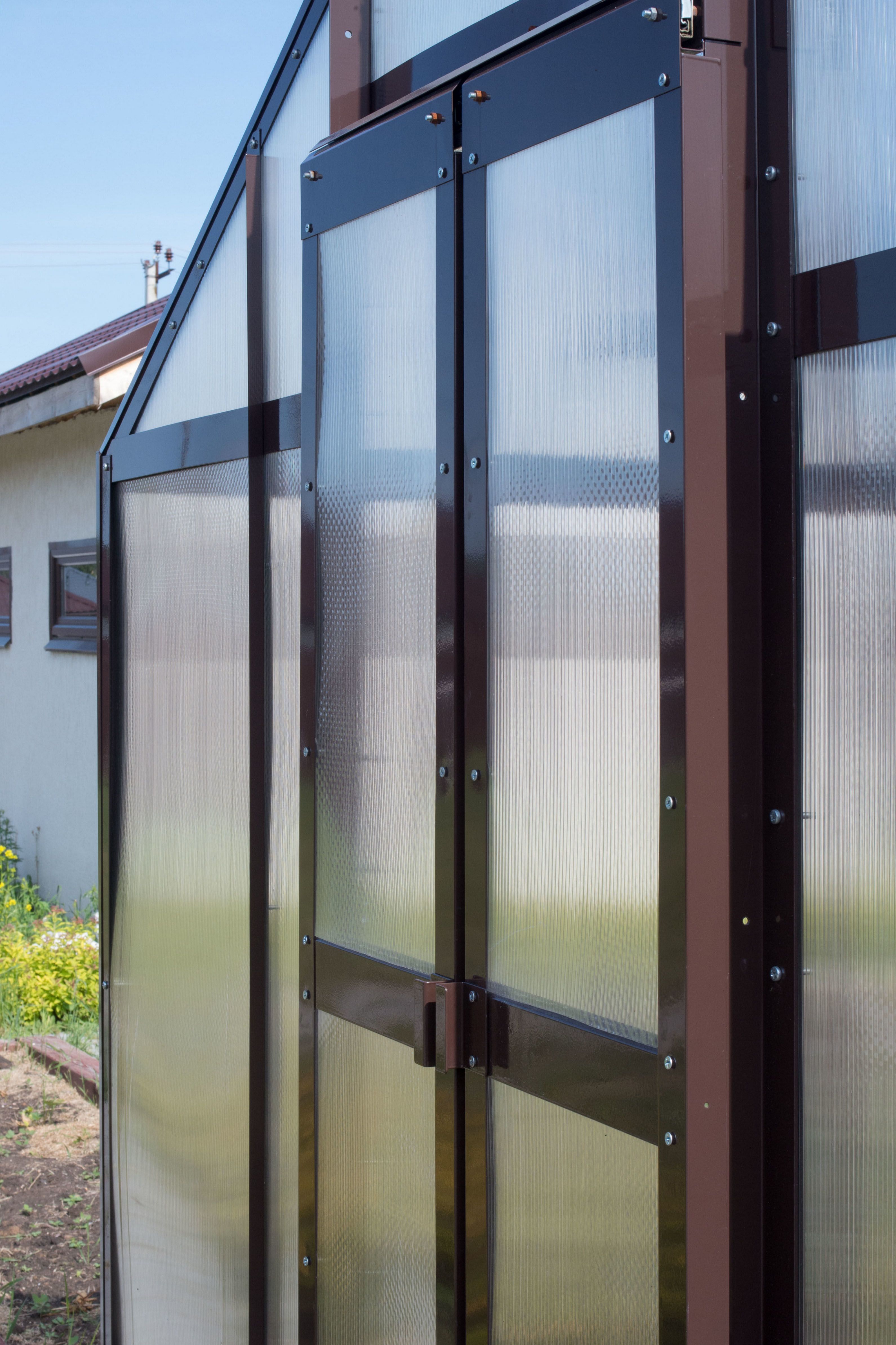 - Покрытие — сотовый поликарбонат 4–6 мм. Он удерживает тепло и рассеивает солнечный свет, создавая благоприятные условия для растений.