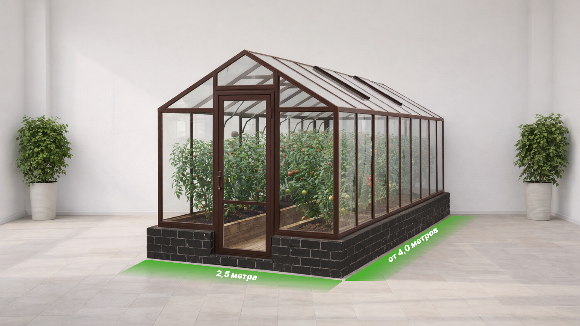 - Базовая длина 4,0 метра с возможностью увеличения секциями 0,65 м и дополнительной секцией 0,35 м обеспечивает гибкую модульность, так как вы можете адаптировать теплицу практически под любой уже существующий фундамент, и вам не придётся переделывать основание или жертвовать визуальным балансом.