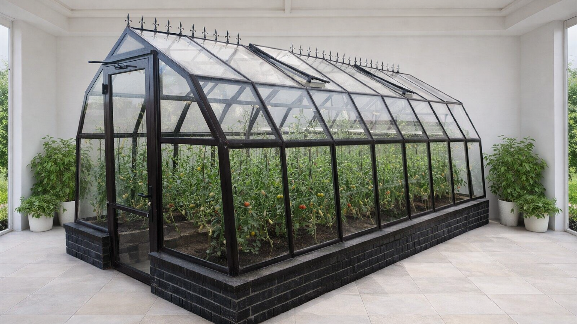 Мансардная теплица с трёхскатной крышей в дизайнерском стиле, которая выглядит на каждом участке уникально. Она подойдёт вам, если вы хотите не просто выращивать растения, а установить на участке архитектурно привлекательную форму с аккуратной стеклянной геометрией и продуманным внешним видом.