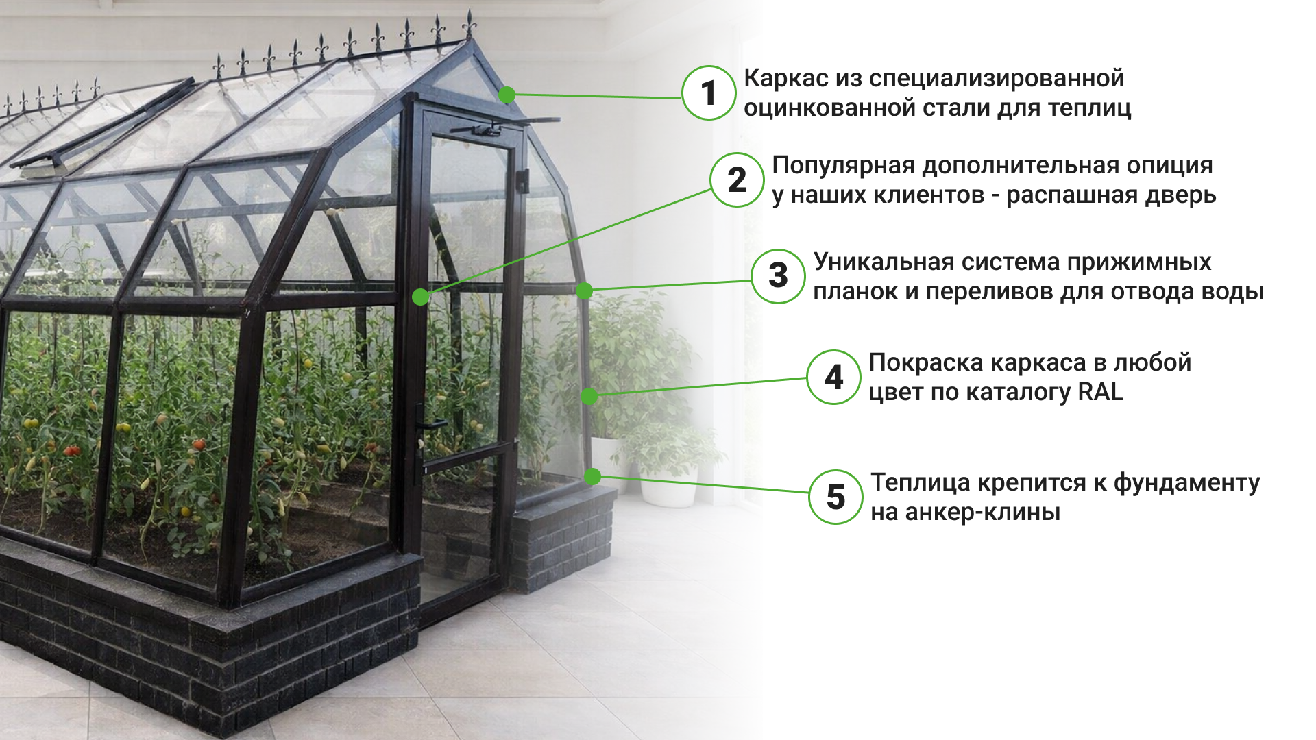- Откидная ручная форточка в торец создаёт сквозное проветривание, благодаря чему снижается риск перегрева растений.