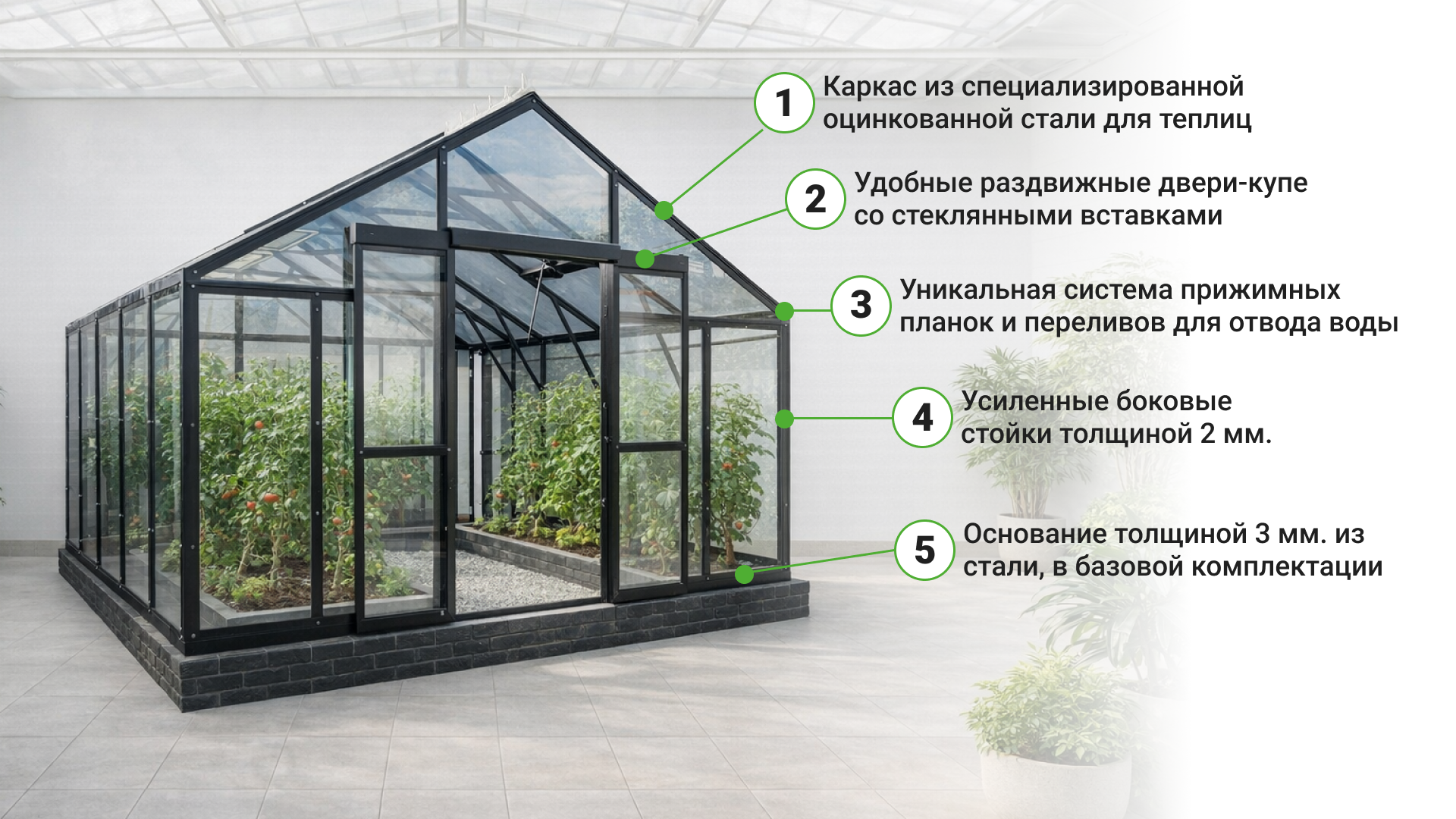 Наша теплица разработана и производится на собственном предприятии, поэтому вы получаете гибкость в выборе конфигурации и уверенность в качестве каждой детали.